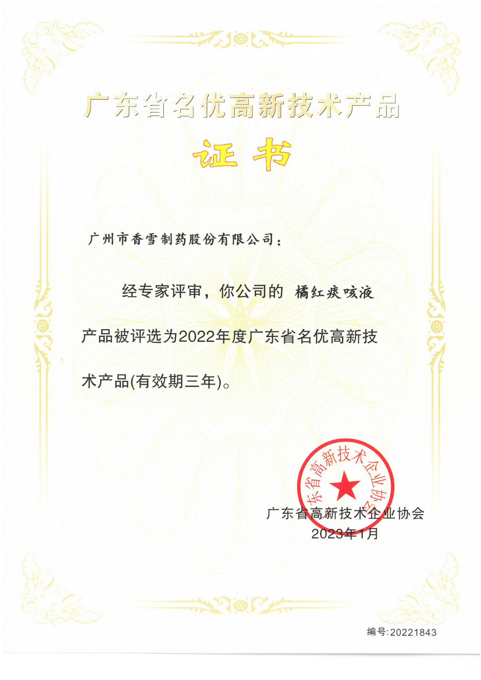 广东省名优高新技术产品——橘红痰咳液