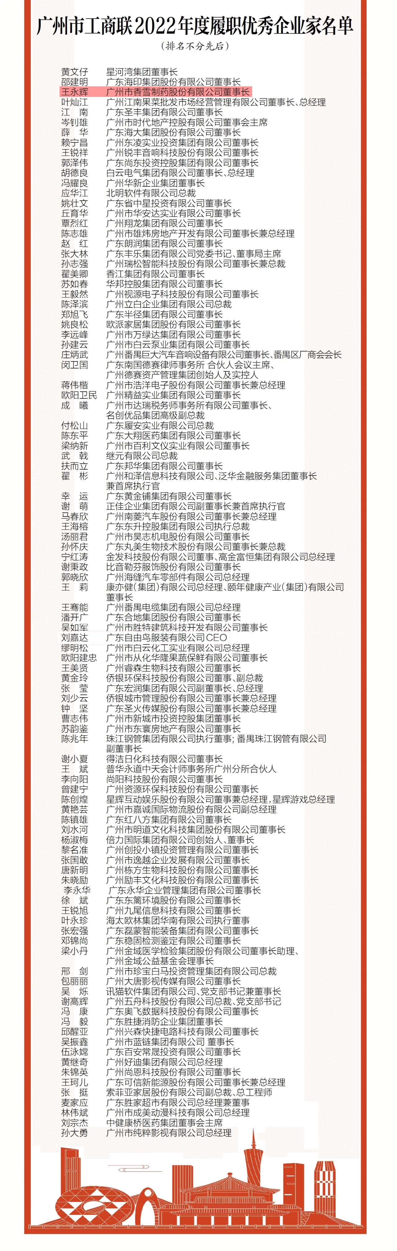 通报指出,2022年,面对复杂严峻的国际形势、新冠肺炎疫情持续影响、经济下行压力加大等多重困难叠加的重大考验,全市广大民营企业家坚持以习近平新时代中国特色社会主义思想为指导,艰苦奋斗,敢闯敢干,勇于创新,带领企业在攻坚克难中砥砺前行,在稳中求进中奋发进取,为广州市经济社会高质量发展作出了重要贡献,涌现出一批勇立时代潮头、走在时代前列的优秀企业家。