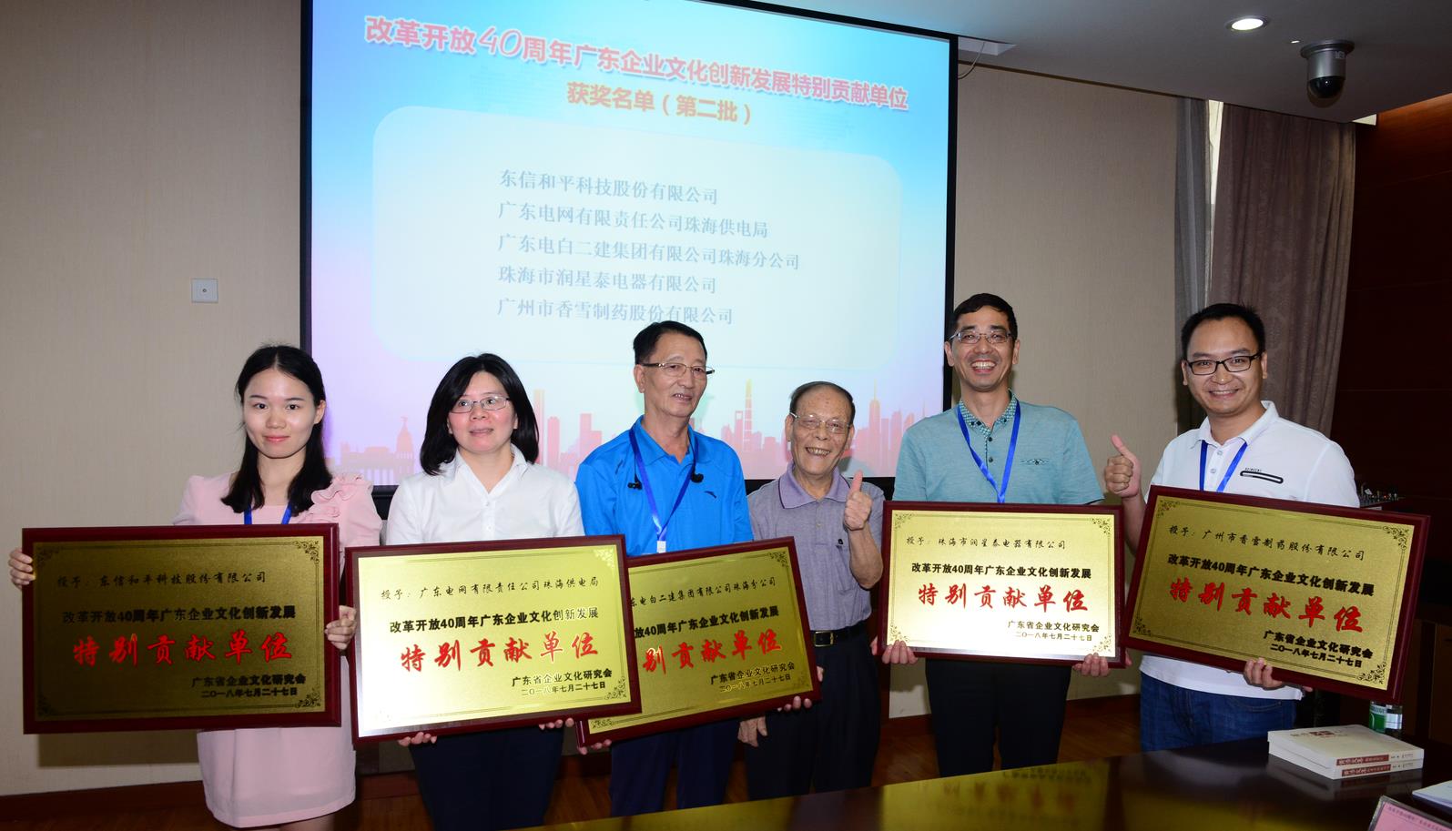 (广东省委宣传部原副部长、省文明办主任,原广东省企业文化研究会会长蓝红为“改革开放40周年广东企业文化工作创新发展特别贡献单位”获奖企业代表颁发奖牌)
